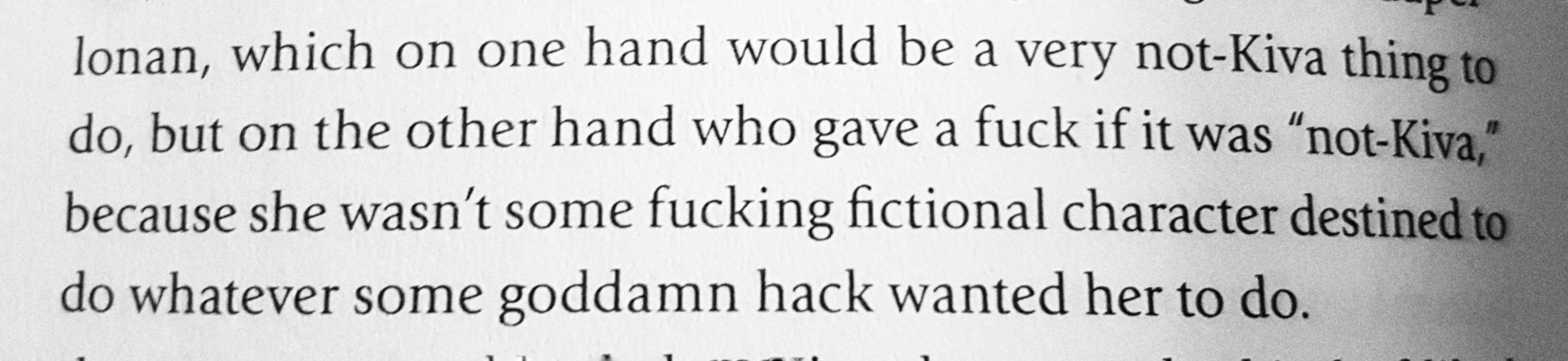 Some deliciously funny writerly meta-snark from John Scalzi’s The Consuming Fire.