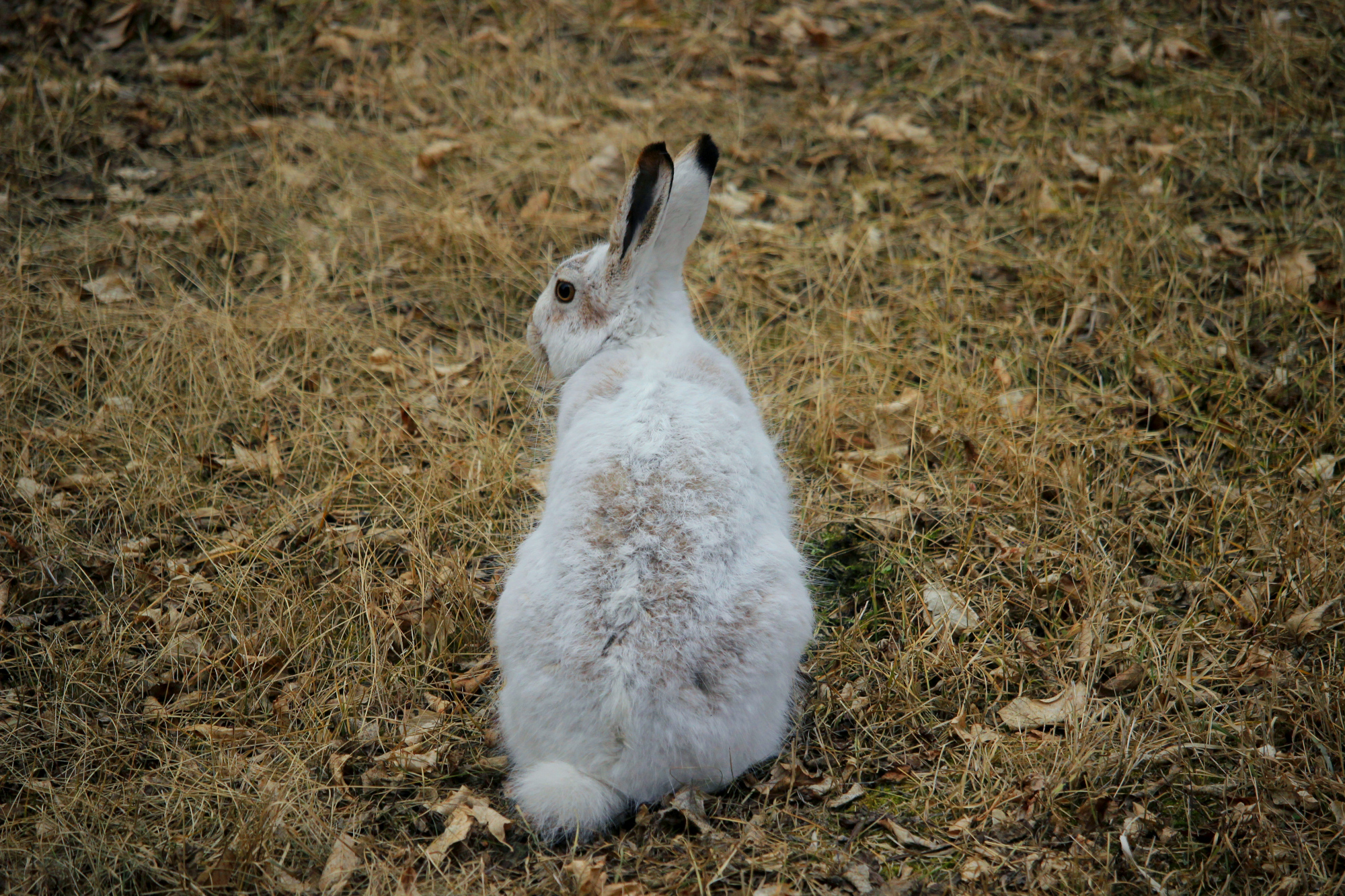 Hoss, hunkered down in our yard on a windy, drizzly spring evening.